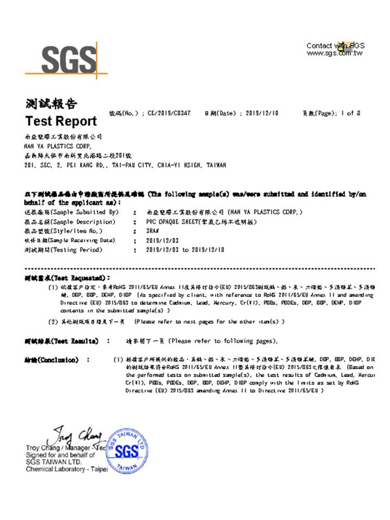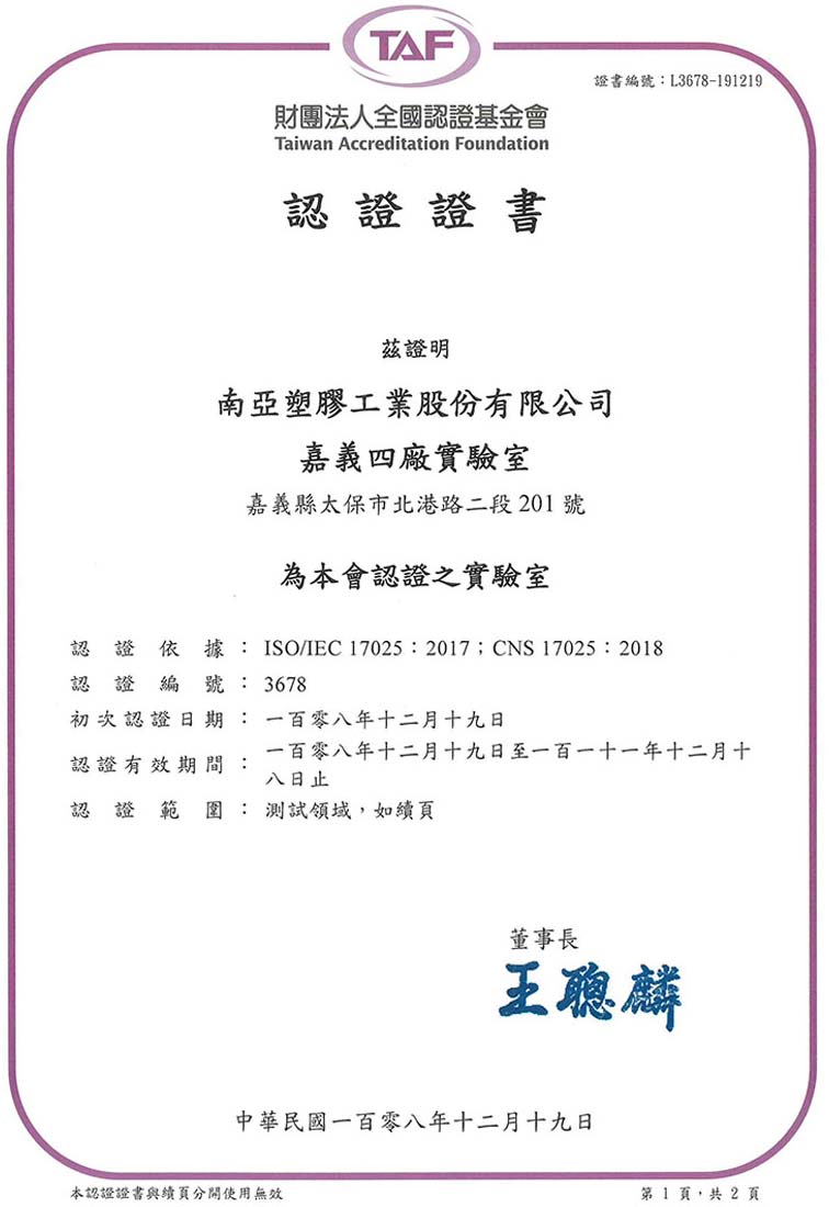 At first, Nan Ya plate factory was established in 1984 with 3,000 tons of its monthly capacity. Then, the formula of plate replaced lead with tin through market expansion and equipment enhancement in 1993. A year late, Nan Ya developed a series of foam sheets, skin-foam sheets, and A-PET clear sheets. Moreover, new machine was introduced to increase production capacity of PVC plate (5’). Additionally, Nan Ya strives to improve the formula and manufacturing process of plate, where its related products have continuously been researched, developed, and launched by Nan Ya. As a result, accredited by ISO-9001, ISO-14001, OHSAS-18001 (Occupational Health and Safety Management Systems-Requirements ), UL, FM Approvals, and TAF (Certification Date: December 19, 2019), Nan Ya plate successfully earns a worldwide reputation for quality. Furthermore, Nan Ya endeavors to develop special plates and broaden their scope of use. Eventually, based on “Industry 4.0,” Nan Ya successfully establishes plate smart factory, which is beneficial to the improvements of production capacity and R&D of plate. In short, we have strong confidence of providing the finest product quality and the best after-sales service to our customers.